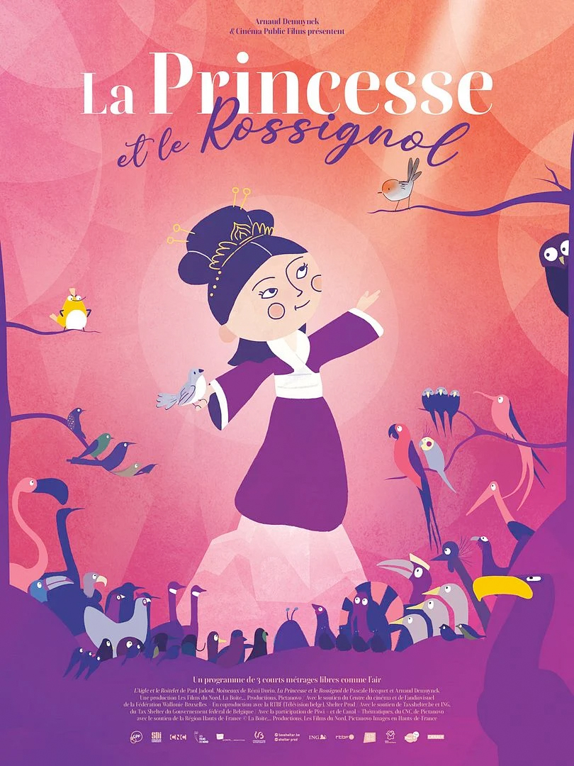 SYPNOSIS Trois histoires douces et pleines de poésie, où de jeunes héros prennent leur envol. Un tout petit oiseau qui défie un plus grand que lui, un jeune moine qui suit un moineau au-delà du temple, une fillette curieuse qui rêve de liberté… Chacun, à sa façon, écoute son cœur et part à la découverte du monde. Un programme tendre et inspirant pour les tout-petits, qui célèbre la curiosité, la liberté et l’enfance. Programme : L’Aigle et le Roitelet (6') : Le Monde des oiseaux doit élire son souverain. L’aigle royal s’avance, certain d’être le seul digne du trône. Aucun oiseau n’ose le contester… sauf le minuscule roitelet. D’une voix tremblante mais audacieuse, il revendique aussi la couronne. Amusé, l’aigle lui lance un défi : celui qui volera le plus haut deviendra roi. Moineaux (11') : Dans un temple bouddhiste, de jeunes moines entament leur méditation sous le regard bienveillant du maître. Mais l’un d’eux, captivé par un moineau, se laisse distraire et le suit hors du monastère. Ce simple envol devient le début d’un voyage qui l’emporte bien au-delà du temple, à la découverte du monde. Des années passent et lorsqu’il revient, vieilli et empli de sagesse, il retrouve d’autres moinillons en méditation. L’un d’eux, à son tour, aperçoit un moineau… La Princesse et le Rossignol (26') : Cerise, six ans, vit protégée par ses parents dans leur grande propriété. Passionnée par les oiseaux, elle ignore que son père l’empêche de prendre son envol. Tout change le jour de ses sept ans, lorsqu’elle reçoit des jumelles. Elle découvre alors Fleur, la fille du jardinier, qui explore librement le domaine. Fascinée par son récit sur un oiseau inconnu, le rossignol, Cerise n’a plus qu’un rêve: le trouver.