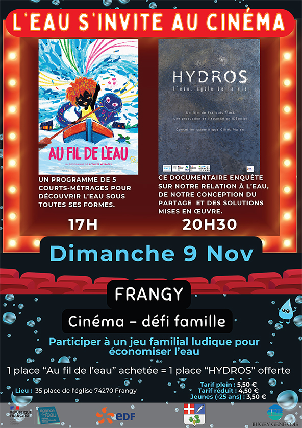L'eau s'invite au Cinéma Le CPIE bugey Genevois vous propose avec Stimul'Usses 2 séance de Cinéma et un défi famille auquel vous pouvez participer. Tarif habituel avec une particularité : 1 place achetée "au fil de l'eau" donne 1 place gratuite pour voir "Hydros".